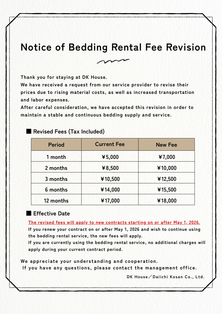 As a result, the bedding rental fees will be revised as follows.